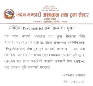 उर्लाबारी / उर्लाबारी – ३ मंगलबारे स्थित मदन भण्डारी अस्पताल तथा ट्रमा सेन्टरमा सोमबारदेखि मनोरोग (साइक्रियाट्रिक) सेवा समेत उपलब्ध हुने भएको छ। अस्पताल प्रशासनले आईतबार एक सूचना जारी गर्दै भोलीदेखि दैनिक रुपमा यो सेवा सञ्चालन हुने जानकारी दिएको छ।