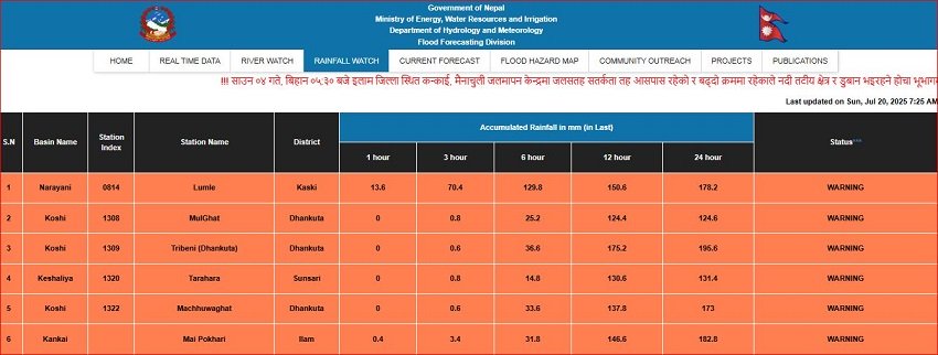कोशी र गण्डकीका केही ठाउँमा ठूलो वर्षा, बाढीको जोखिम